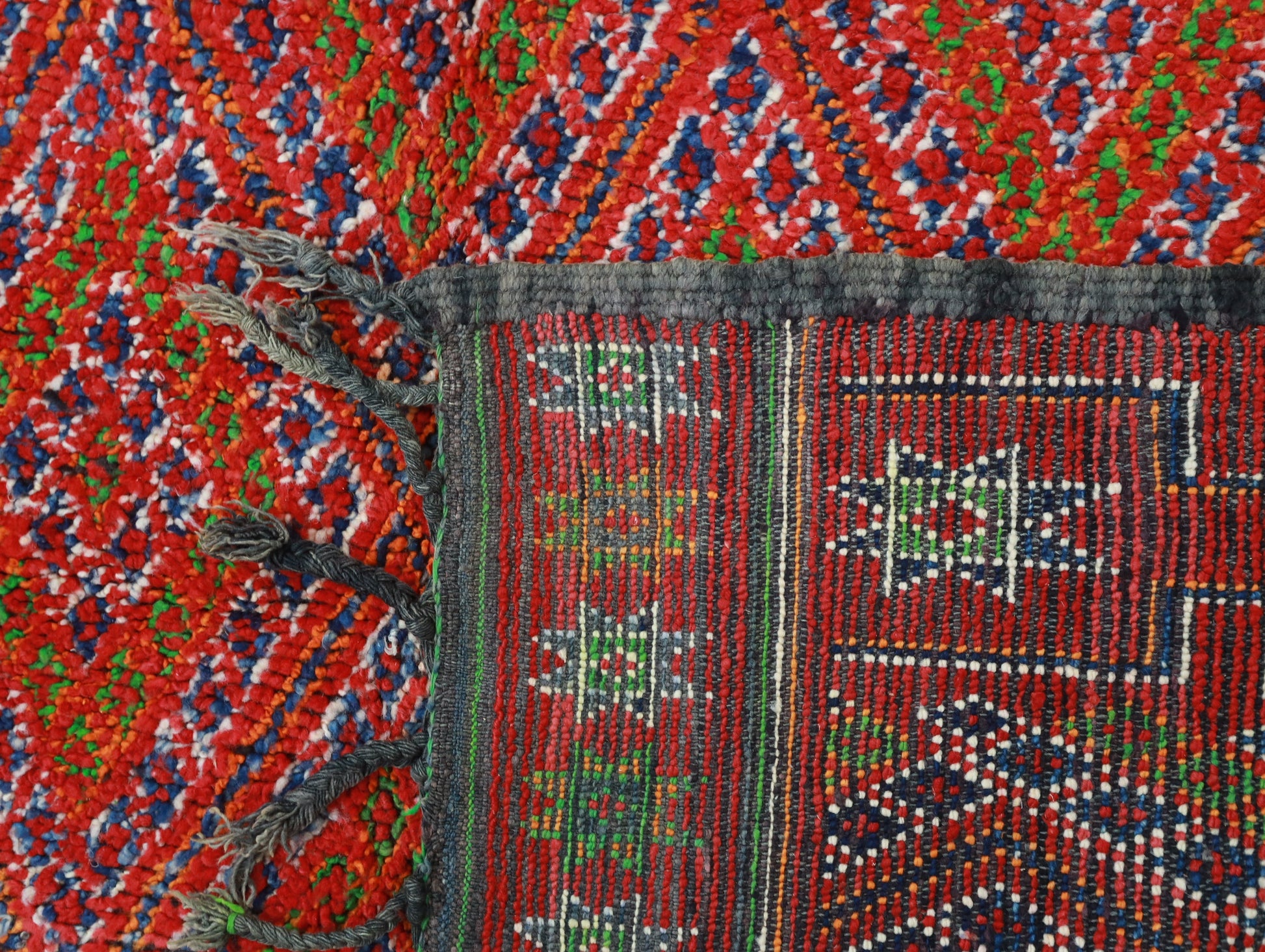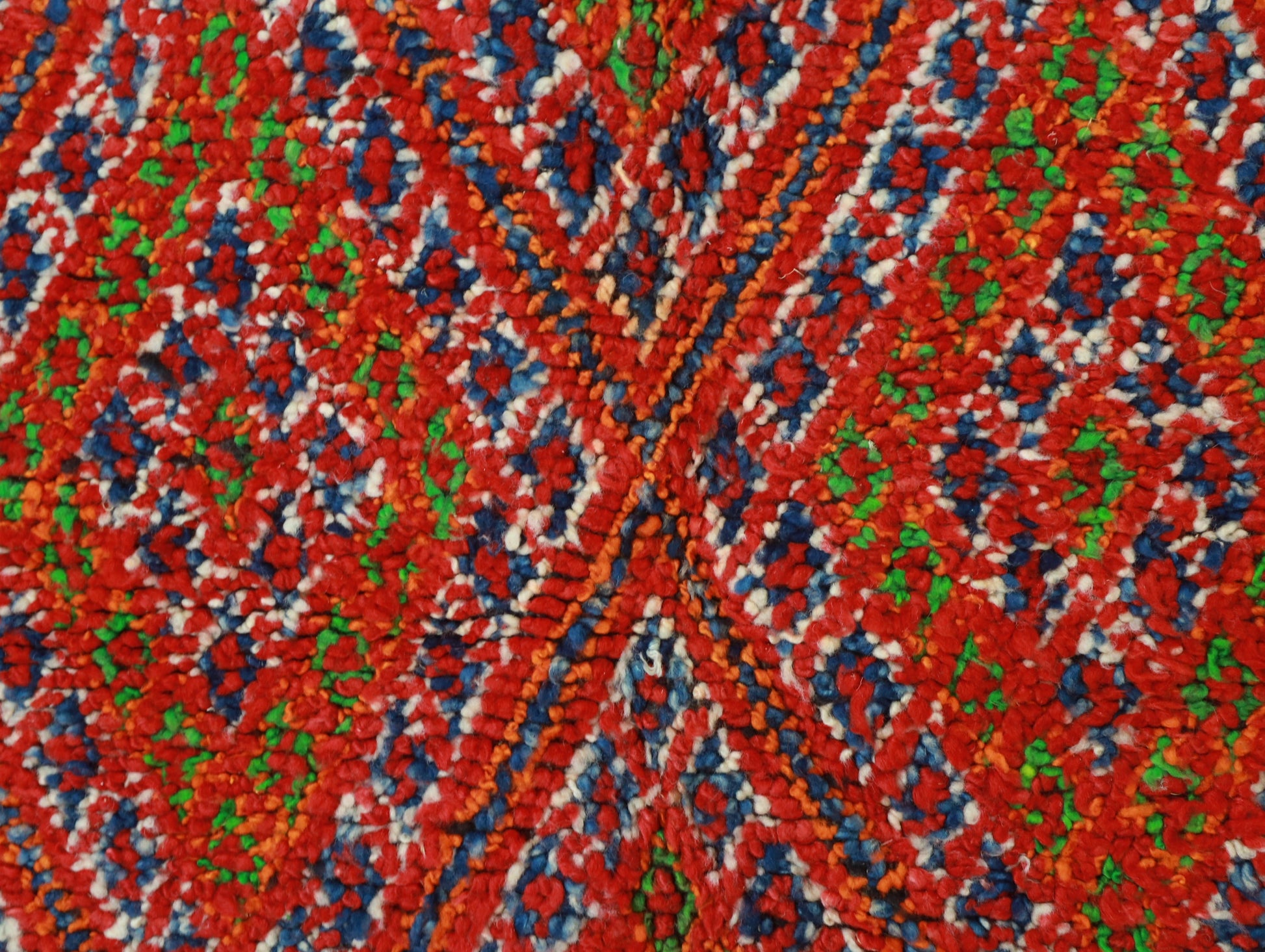 Originating in the Holy town of Boujad, these rugs, woven by diverse tribes, exhibit a wide spectrum of color, composition, and weave. Described as surreal, mystic, and mesmerizing, Boujad rugs transport us to a world beyond reality. Their construction, with twice as many horizontal as vertical knots, renders them floppy and easy to move.