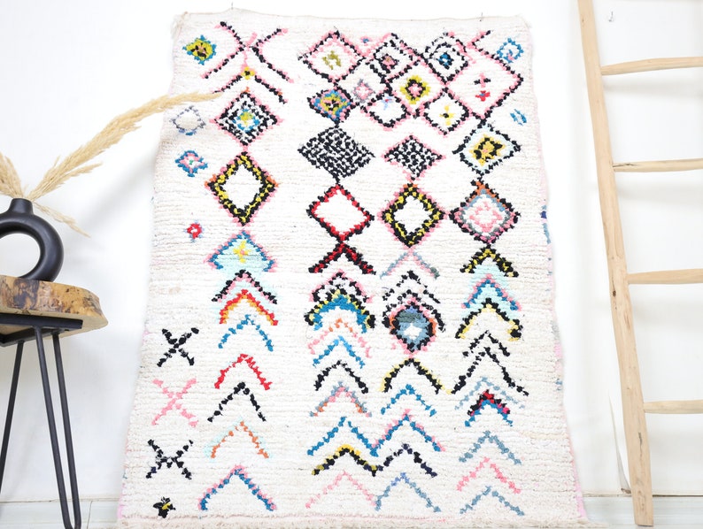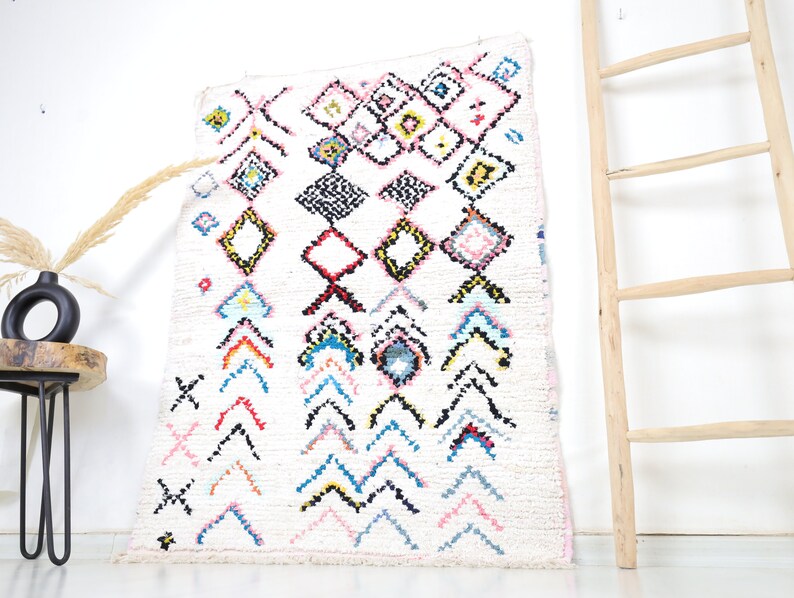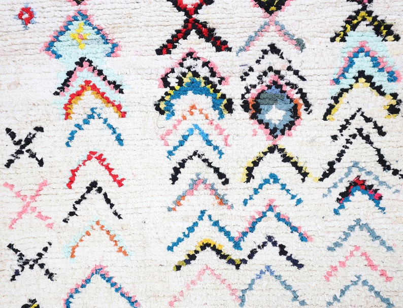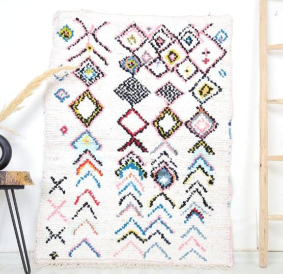 Azilal rugs boast abstract, painterly designs reminiscent of rugs from Ourika. What sets them apart is a vibrant color palette, achieved through the incorporation of cotton alongside wool..