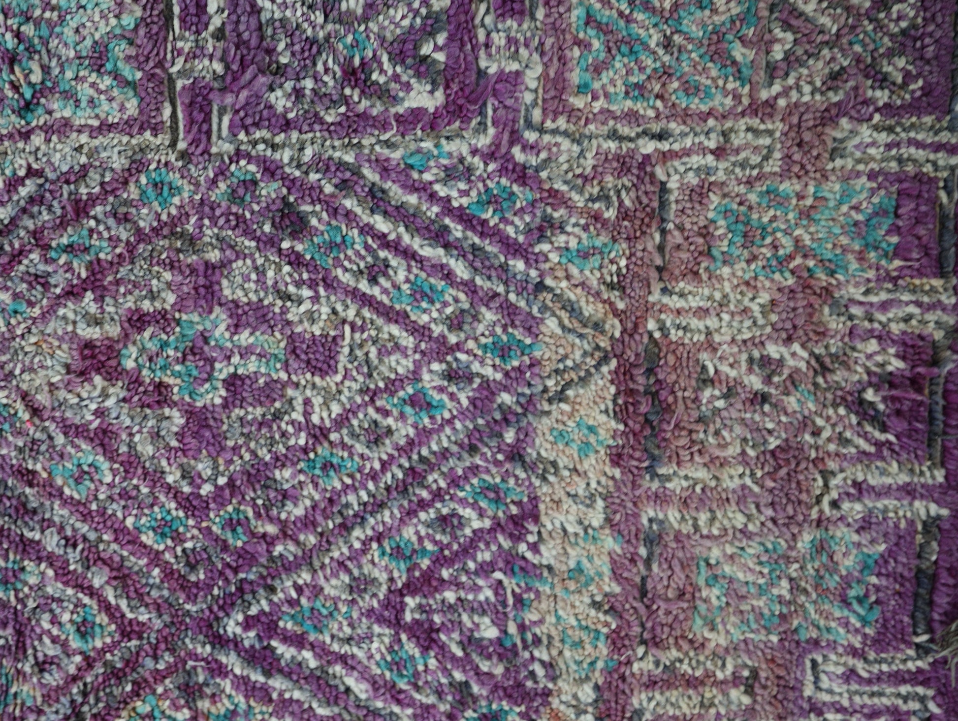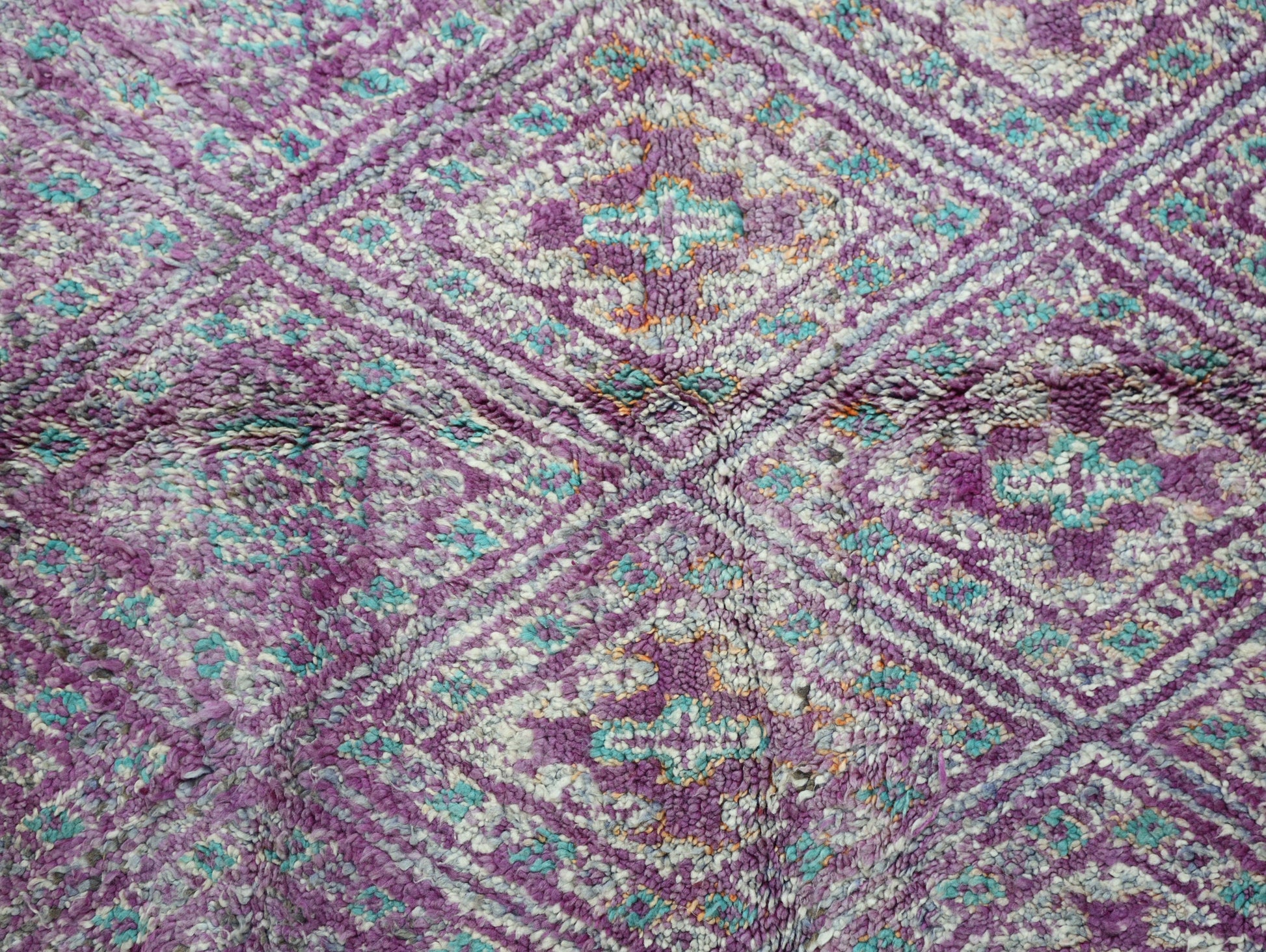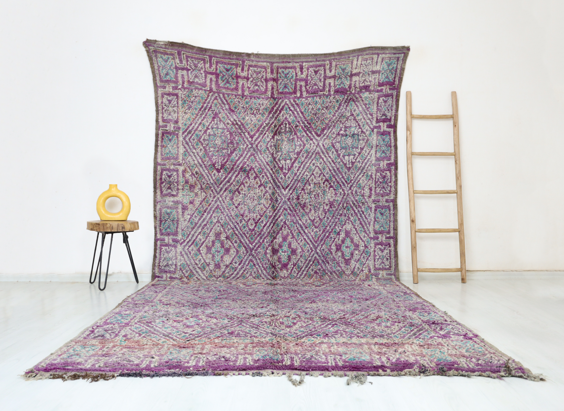 Wool, a sacred material for the Amazigh (Berber) people, forms the cornerstone of Moroccan rug design. Durable, long-lasting, and soft underfoot, wool is both functional and comfortable. In this piece, the wool pile is expertly knotted onto a wool foundation, adding substance and allowing it to gracefully embrace the floor.