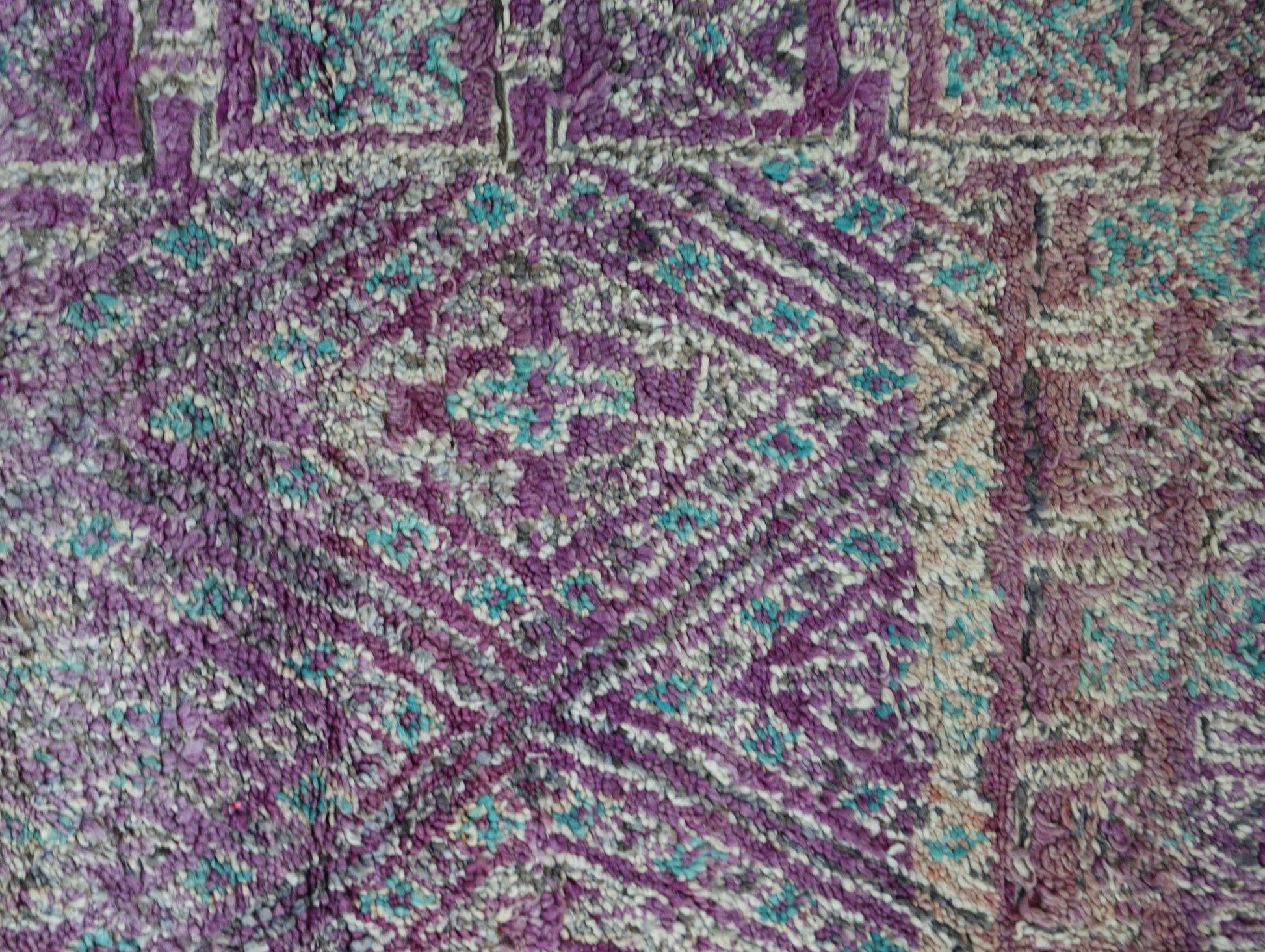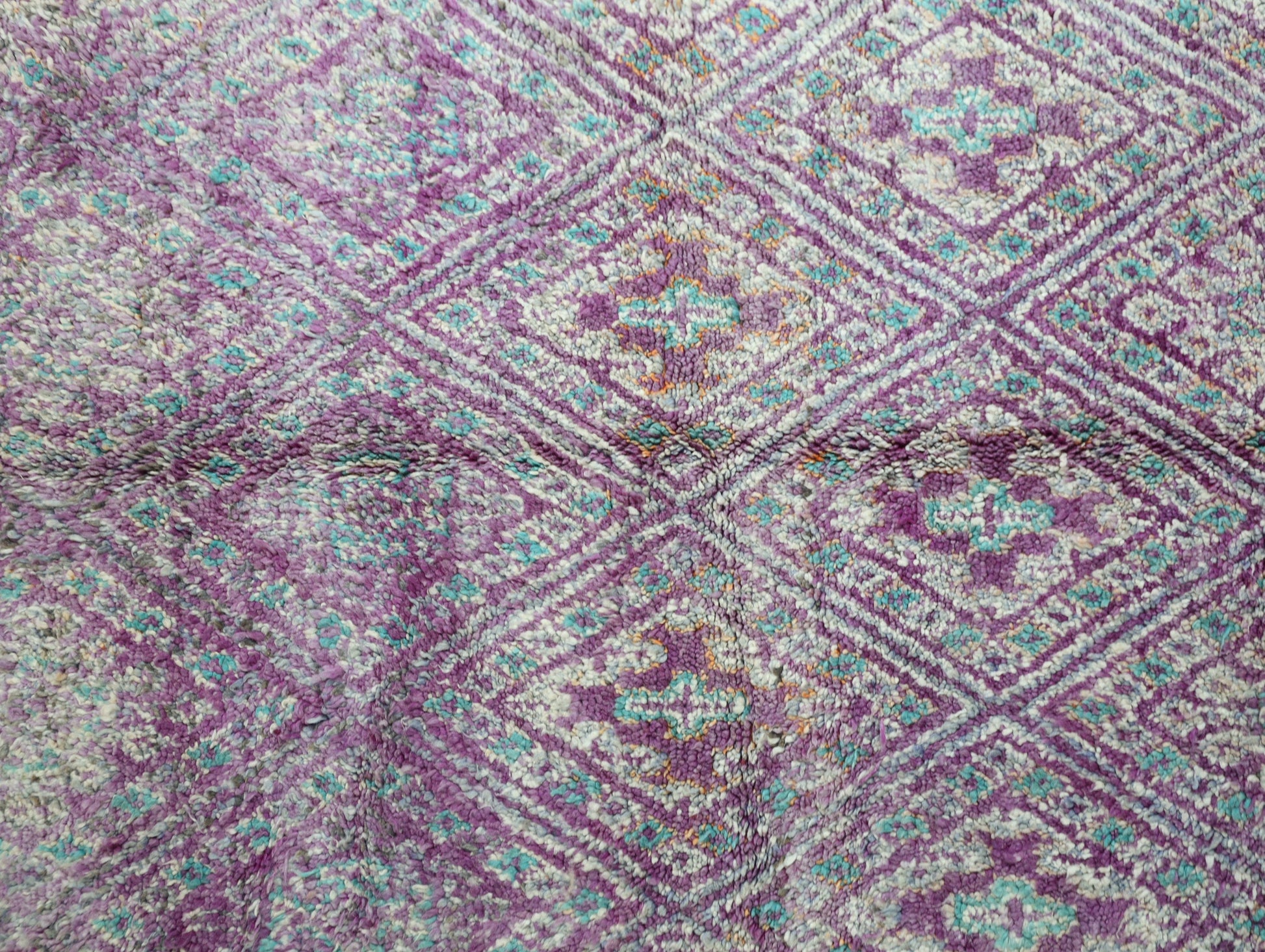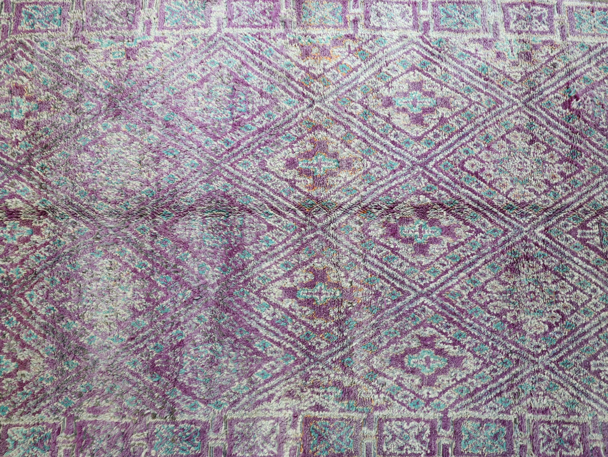 Originating in the Holy town of Boujad, these rugs, woven by diverse tribes, exhibit a wide spectrum of color, composition, and weave. Described as surreal, mystic, and mesmerizing, Boujad rugs transport us to a world beyond reality. Their construction, with twice as many horizontal as vertical knots, renders them floppy and easy to move.