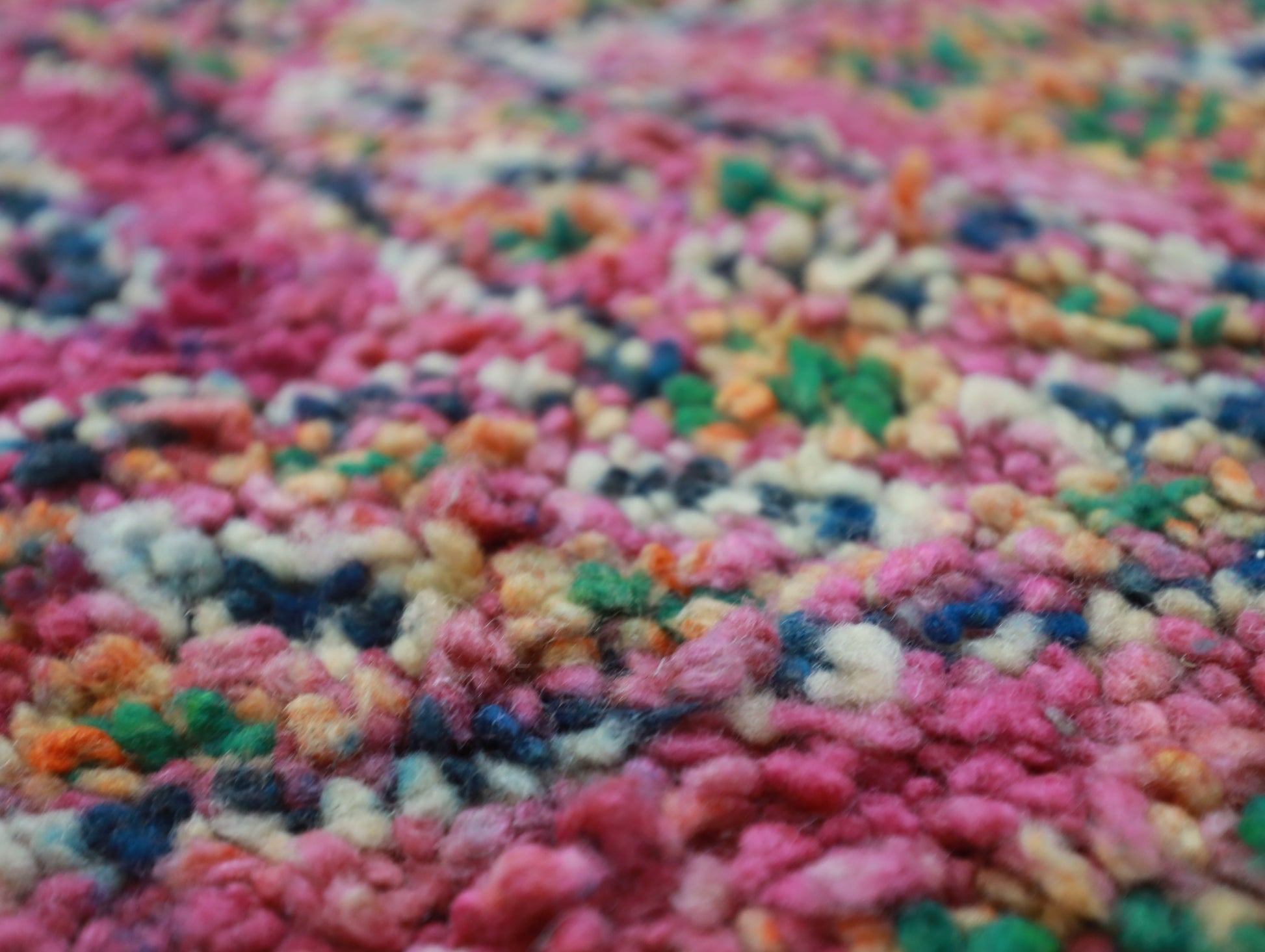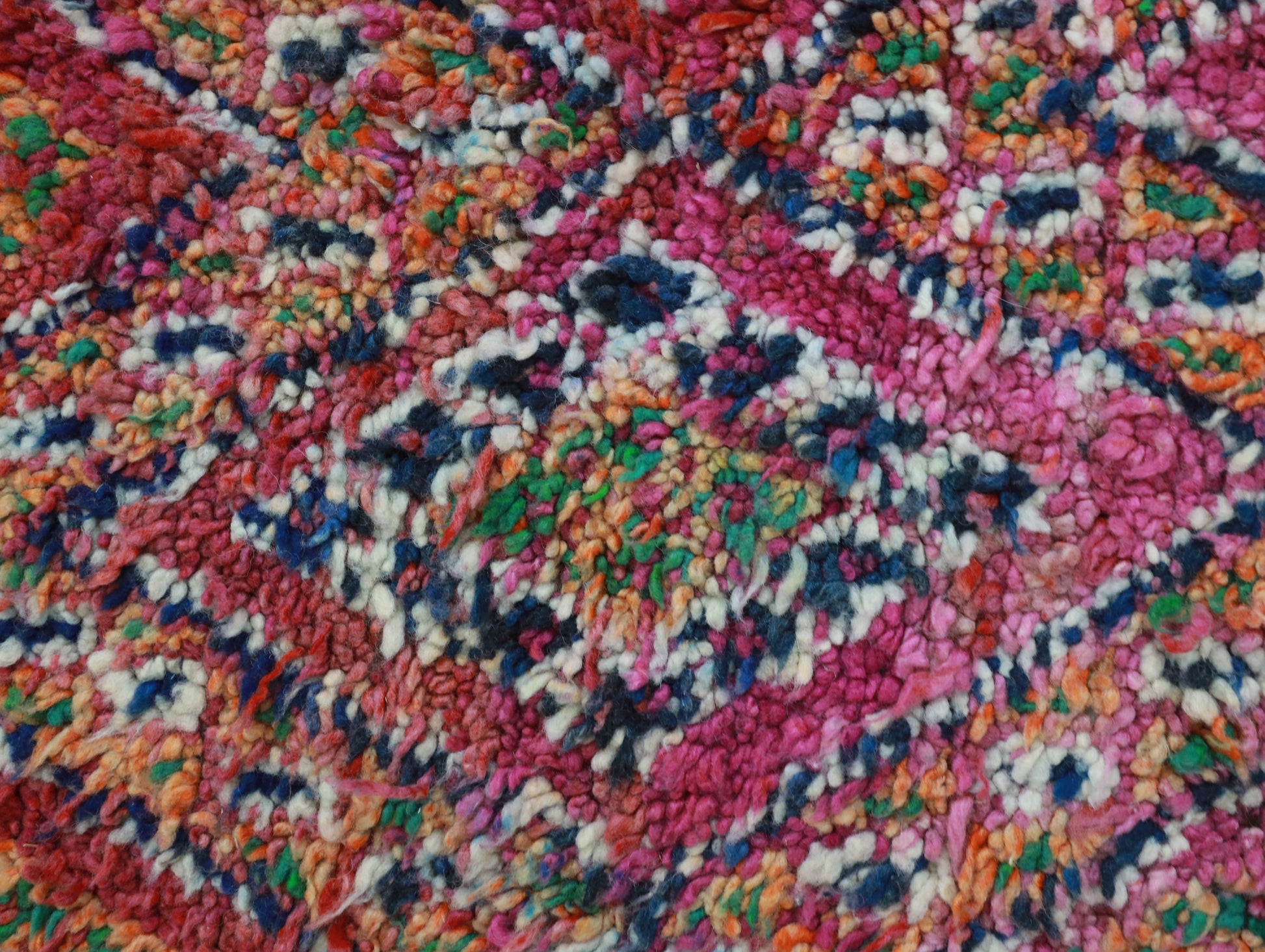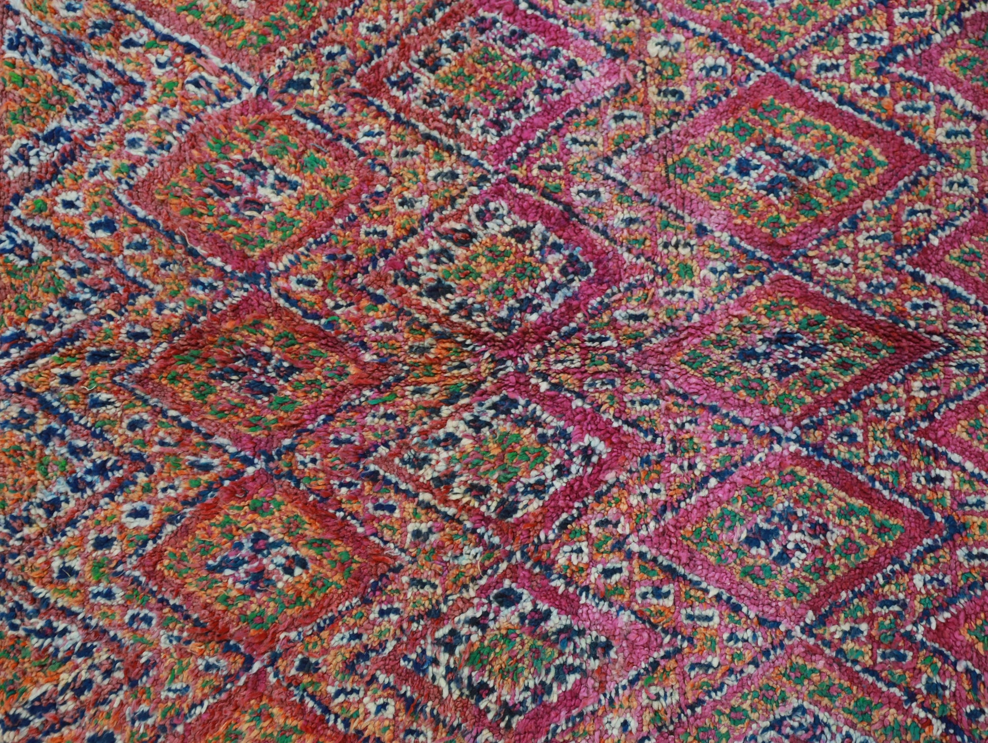 Originating in the Holy town of Boujad, these rugs, woven by diverse tribes, exhibit a wide spectrum of color, composition, and weave. Described as surreal, mystic, and mesmerizing, Boujad rugs transport us to a world beyond reality. Their construction, with twice as many horizontal as vertical knots, renders them floppy and easy to move.