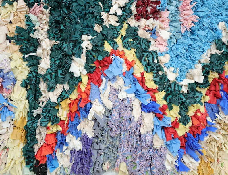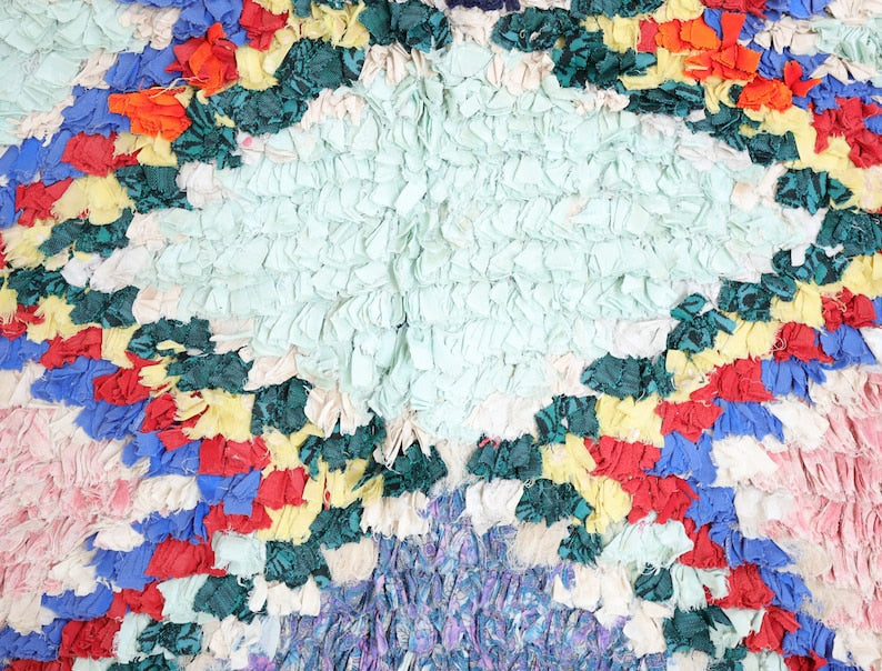 An unparalleled vintage masterpiece, carefully crafted by Berber Tribes in the Boucherouite style using upcycled textiles.