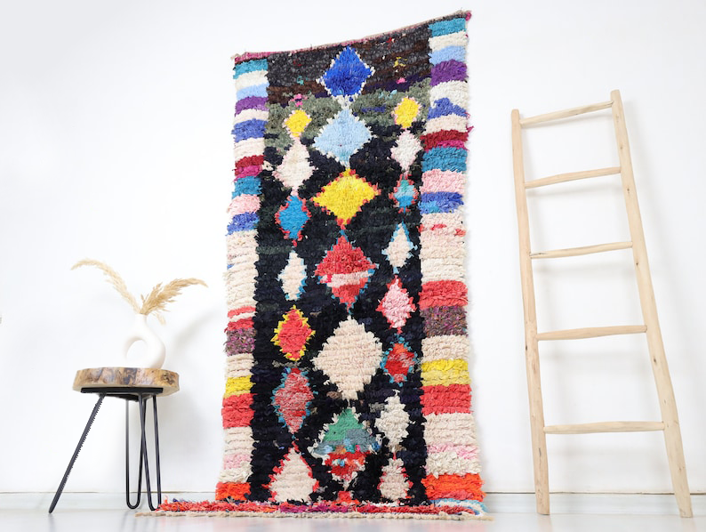 An unparalleled vintage masterpiece, carefully crafted by Berber Tribes in the Boucherouite style using upcycled textiles.