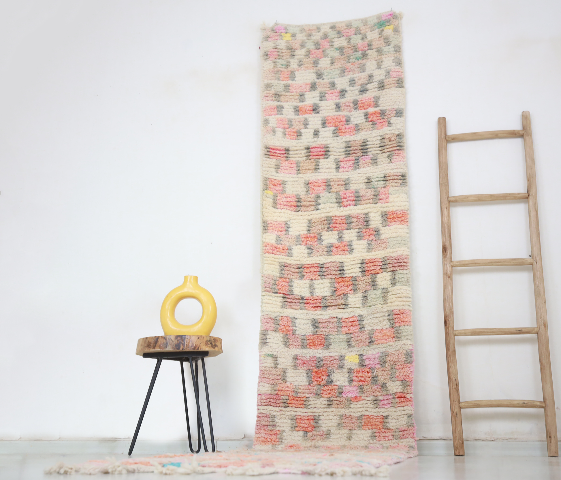 Originating in the Holy town of Boujad, these rugs, woven by diverse tribes, exhibit a wide spectrum of color, composition, and weave. Described as surreal, mystic, and mesmerizing, Boujad rugs transport us to a world beyond reality. Their construction, with twice as many horizontal as vertical knots, renders them floppy and easy to move.
