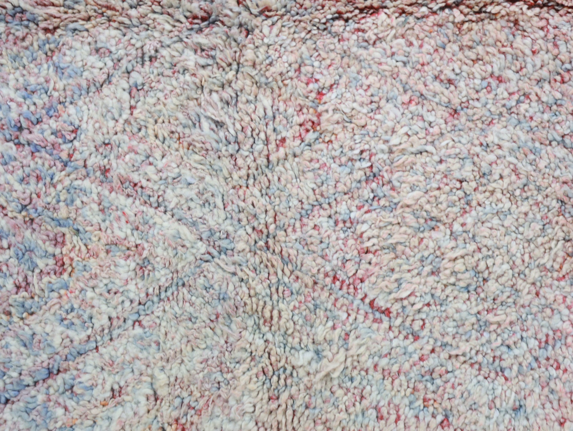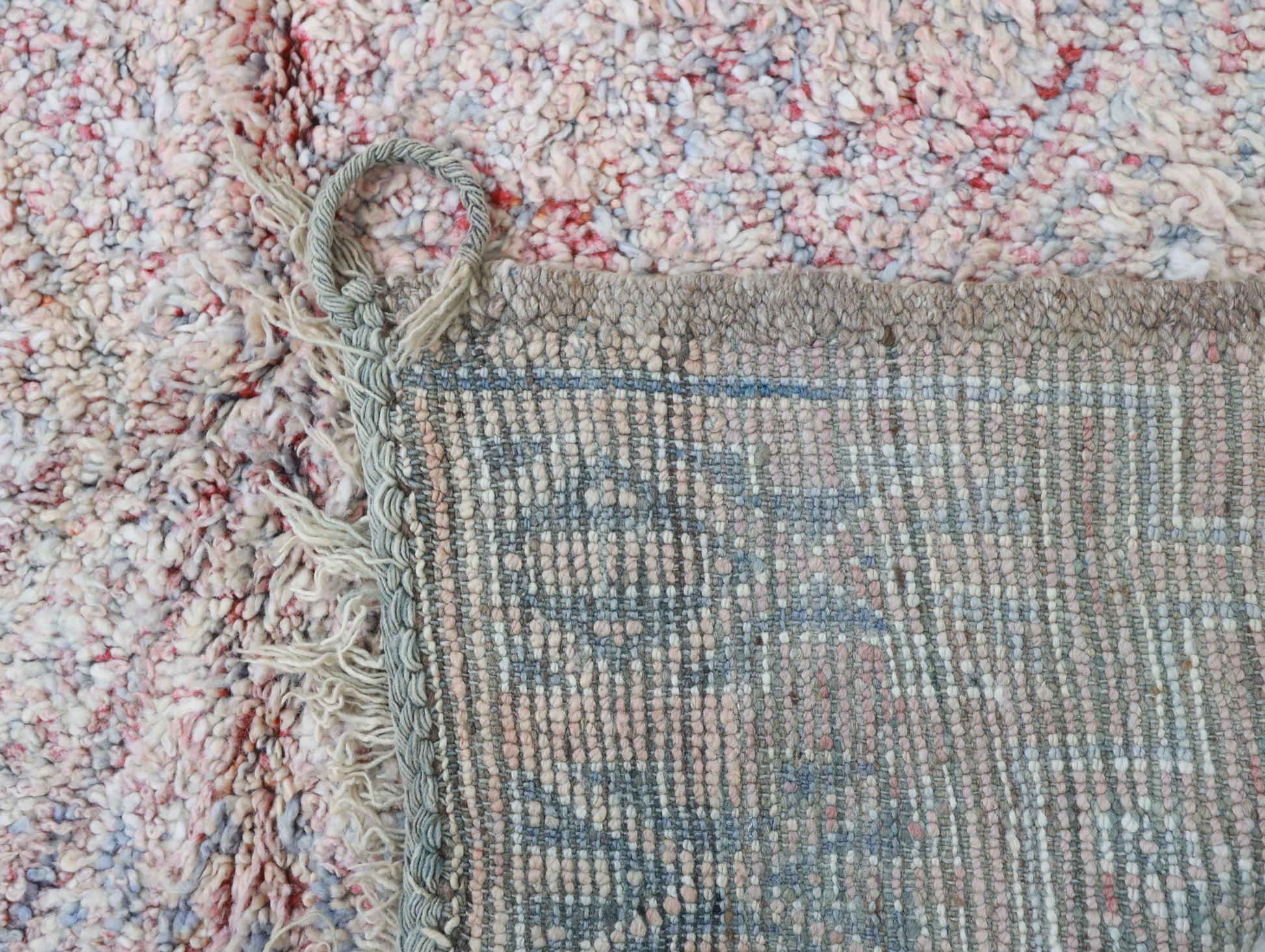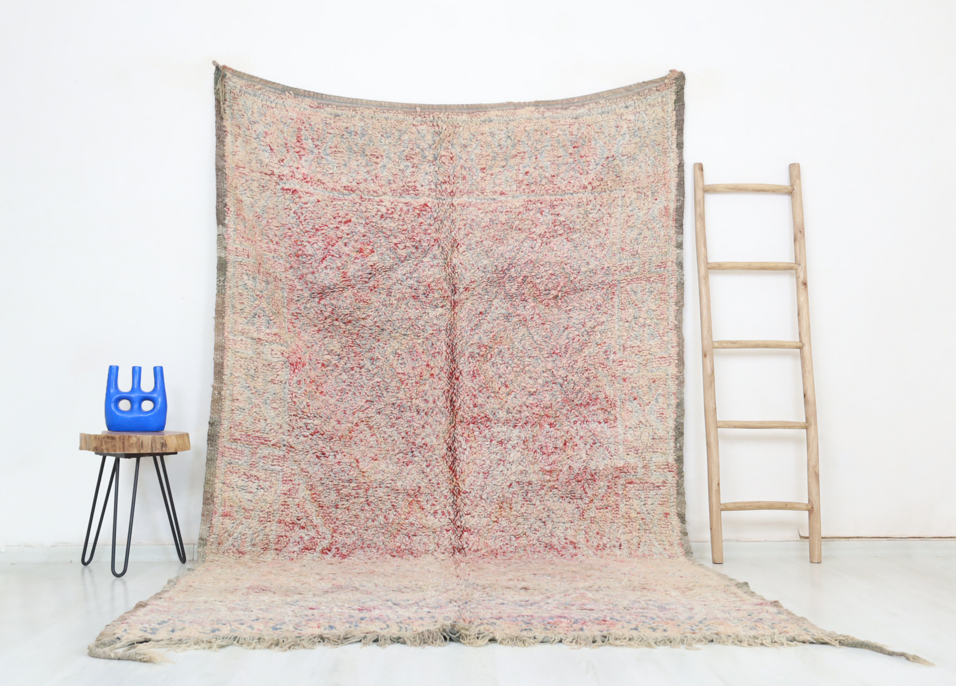 Originating in the Holy town of Boujad, these rugs, woven by diverse tribes, exhibit a wide spectrum of color, composition, and weave. Described as surreal, mystic, and mesmerizing, Boujad rugs transport us to a world beyond reality. Their construction, with twice as many horizontal as vertical knots, renders them floppy and easy to move.