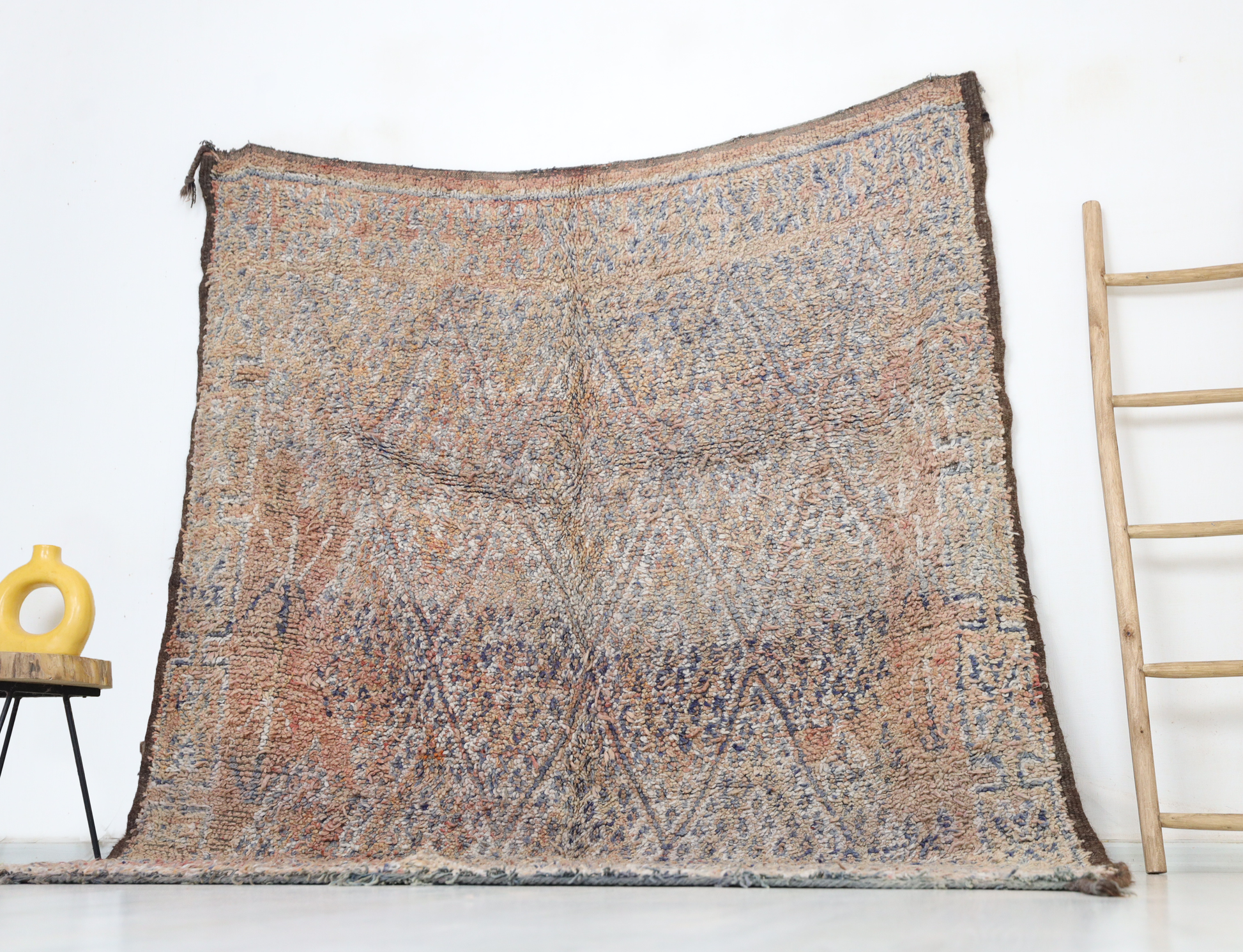 Originating in the Holy town of Boujad, these rugs, woven by diverse tribes, exhibit a wide spectrum of color, composition, and weave. Described as surreal, mystic, and mesmerizing, Boujad rugs transport us to a world beyond reality. Their construction, with twice as many horizontal as vertical knots, renders them floppy and easy to move.