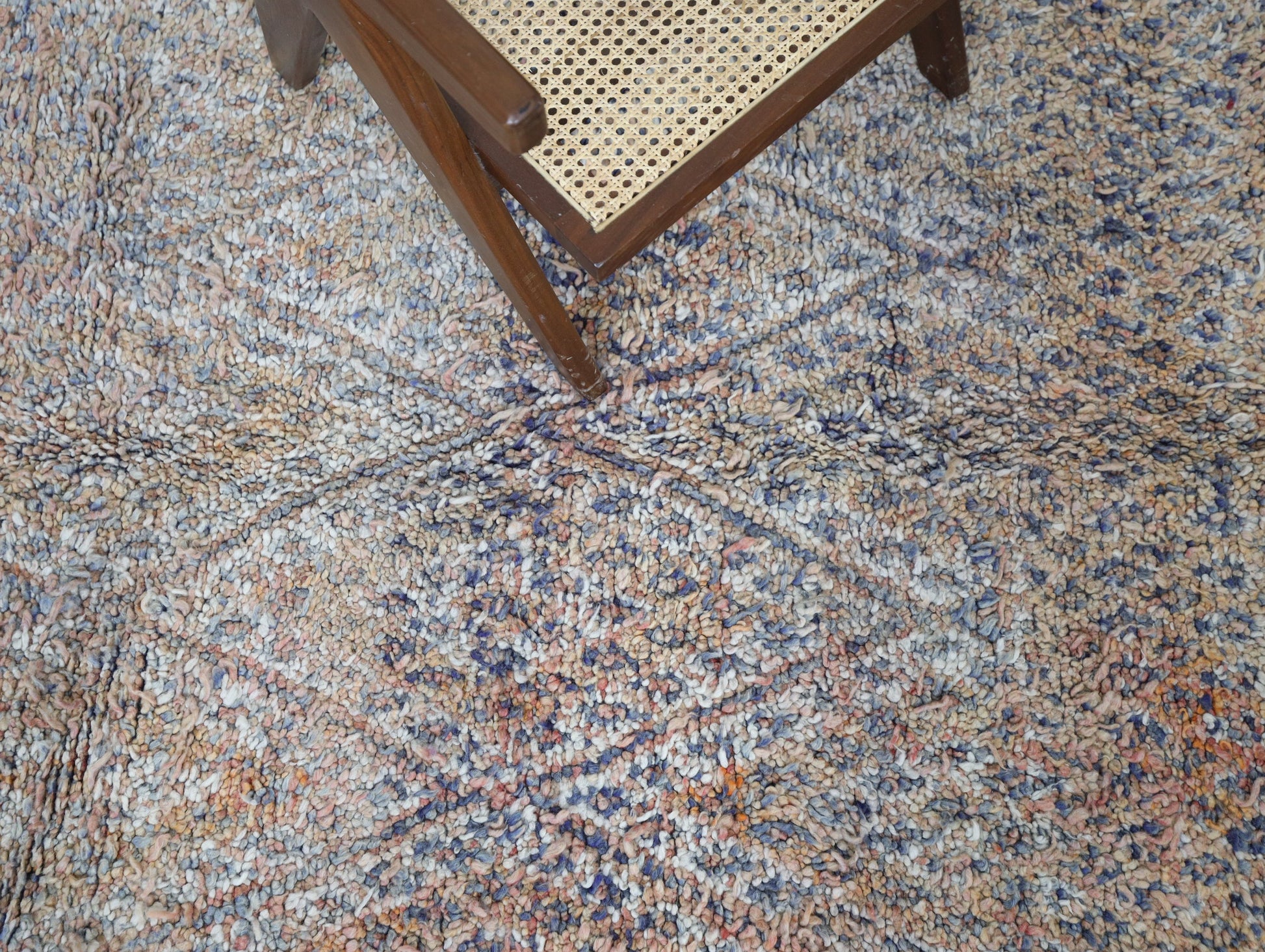 Wool, a sacred material for the Amazigh (Berber) people, forms the cornerstone of Moroccan rug design. Durable, long-lasting, and soft underfoot, wool is both functional and comfortable. In this piece, the wool pile is expertly knotted onto a wool foundation, adding substance and allowing it to gracefully embrace the floor.