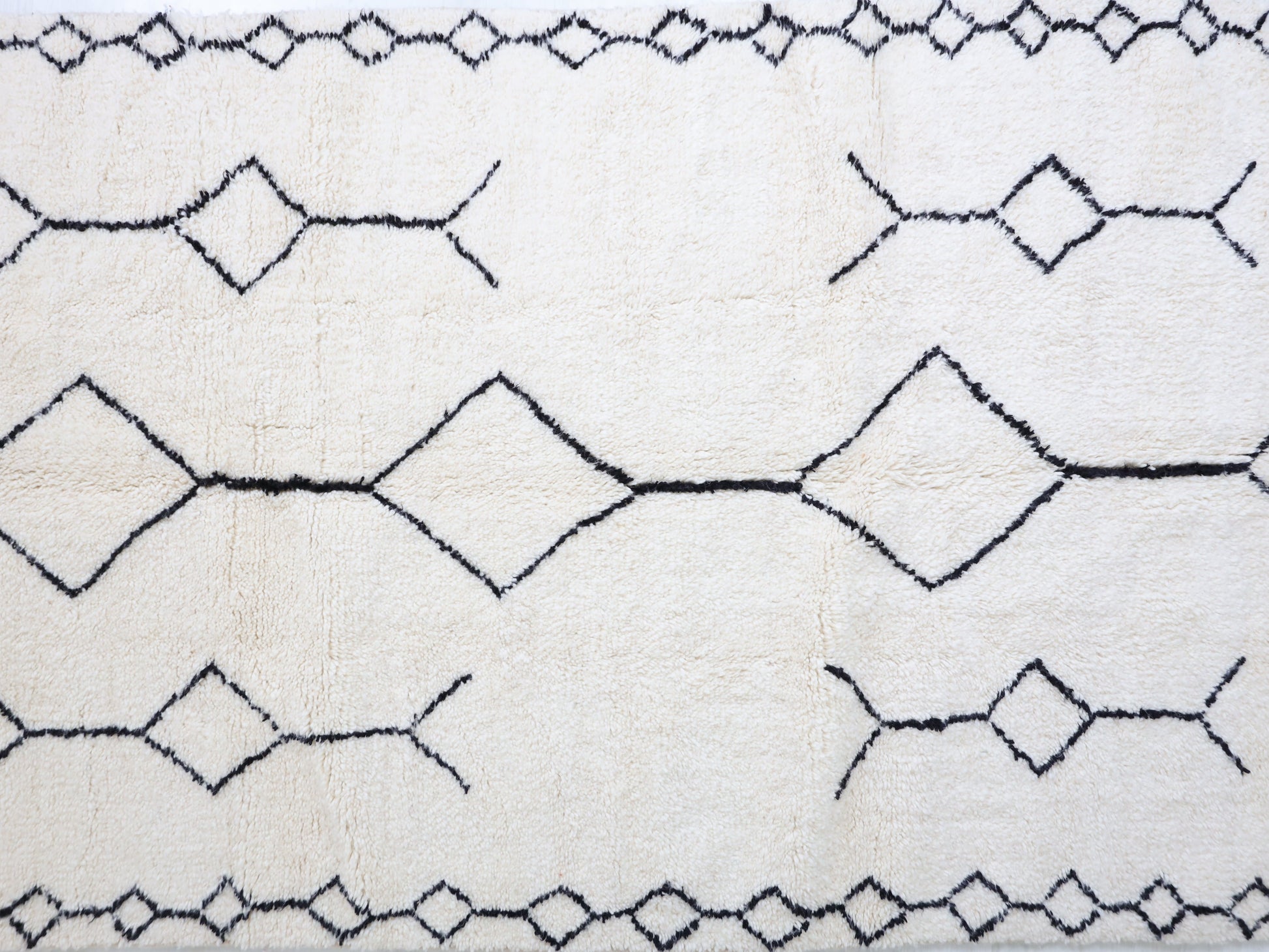 This unique rug, singular in its design, was intricately hand-knotted by the Beni Ourain tribes nestled in Morocco's Middle Atlas mountains.