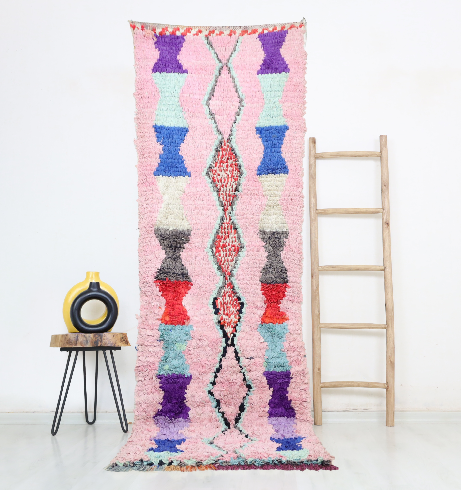 An unparalleled vintage masterpiece, carefully crafted by Berber Tribes in the Boucherouite style using upcycled textiles.