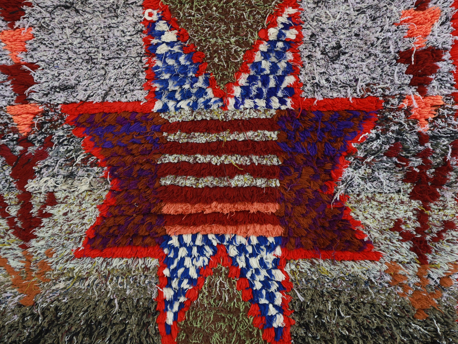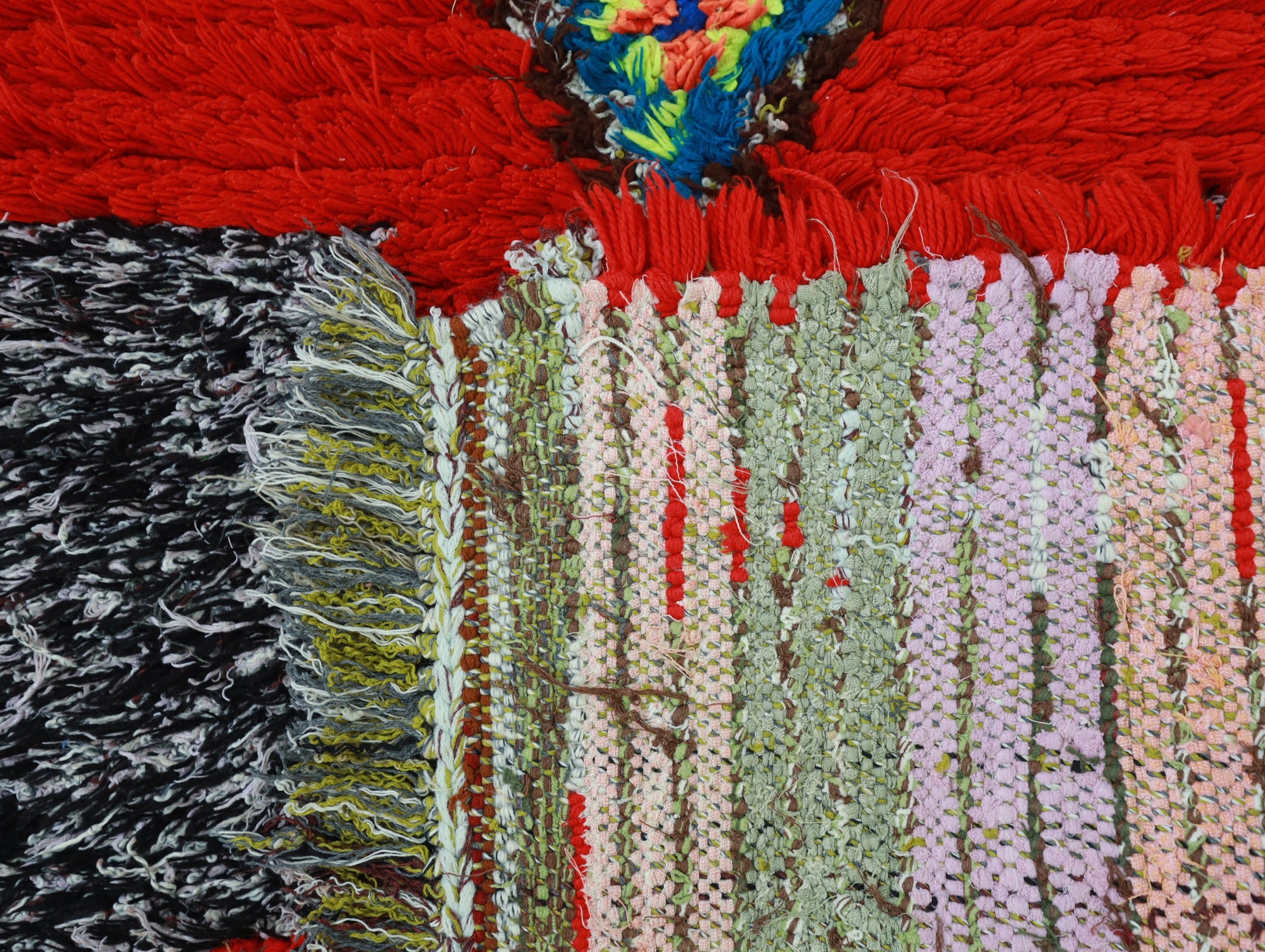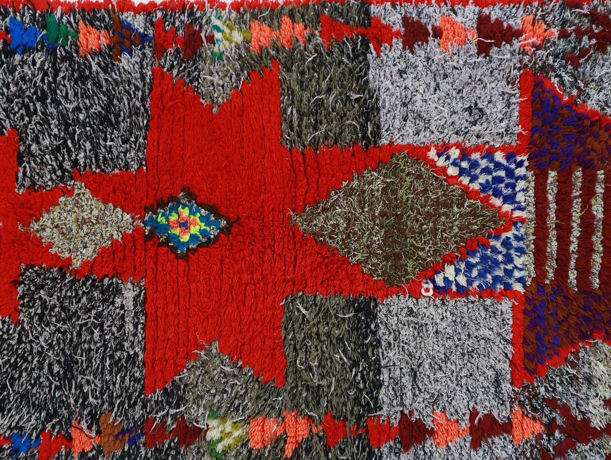 An unparalleled vintage masterpiece, carefully crafted by Berber Tribes in the Boucherouite style using upcycled textiles.