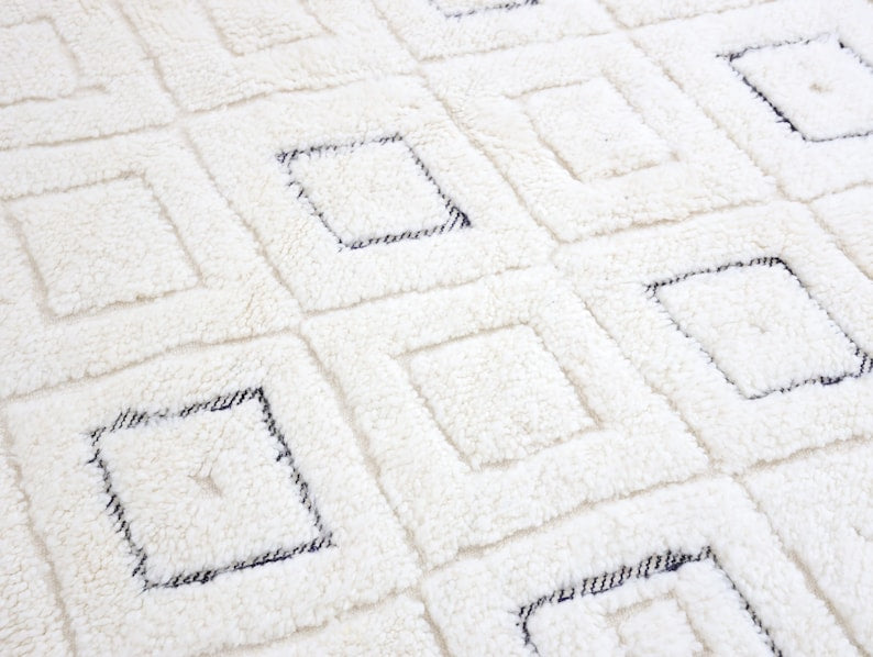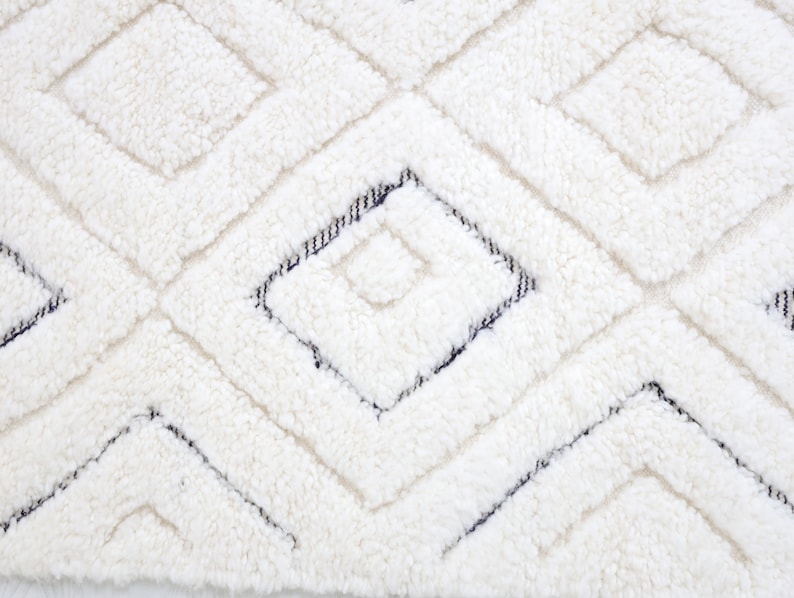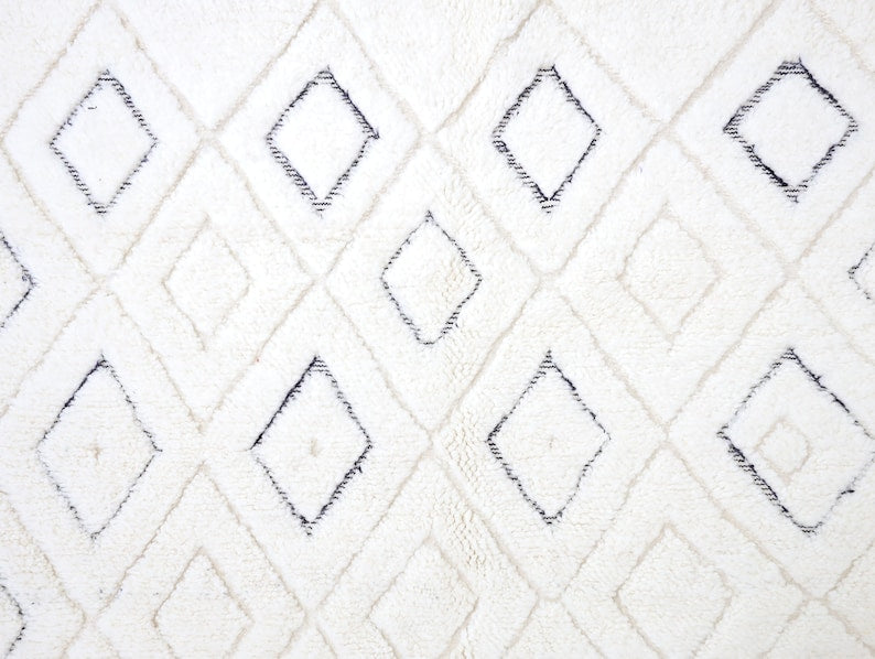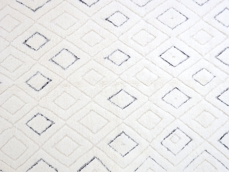 This unique rug, singular in its design, was intricately hand-knotted by the Beni Ourain tribes nestled in Morocco's Middle Atlas mountains.