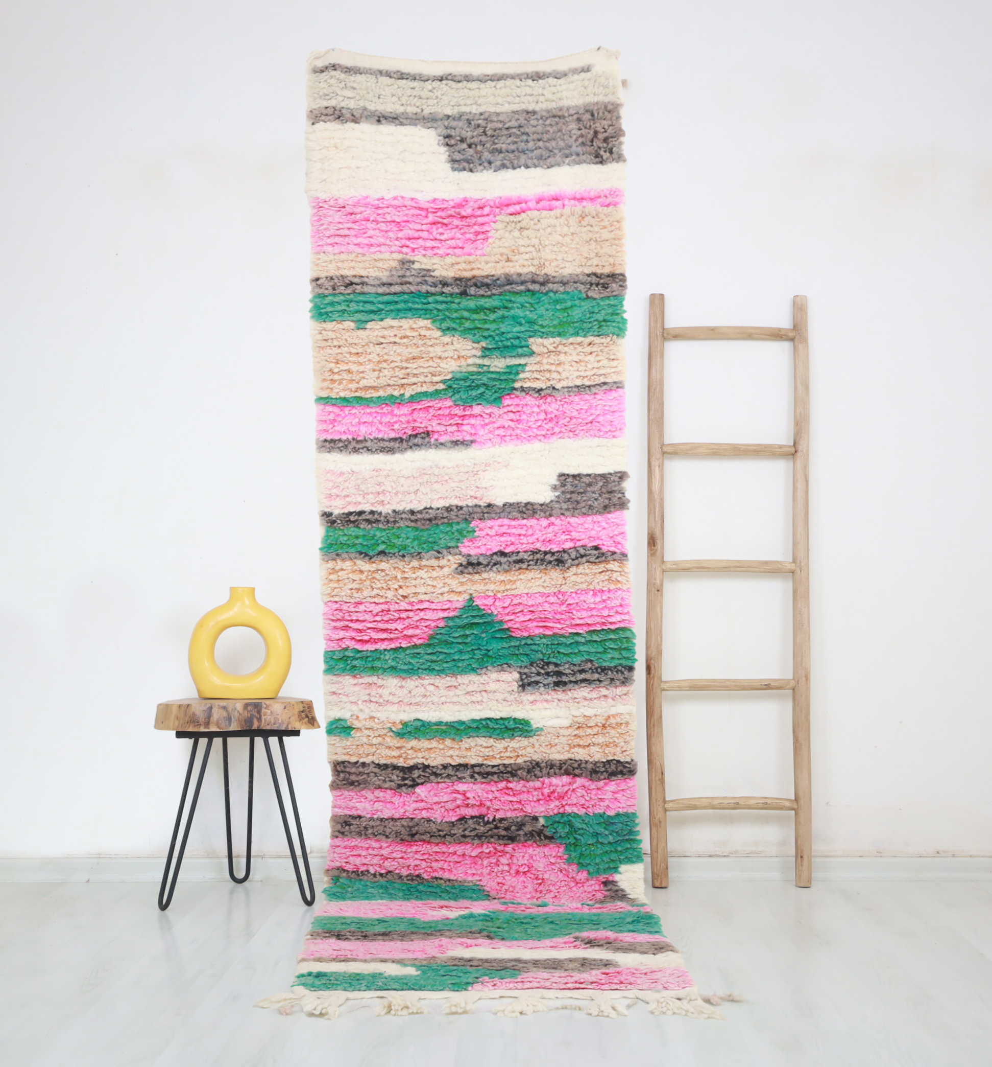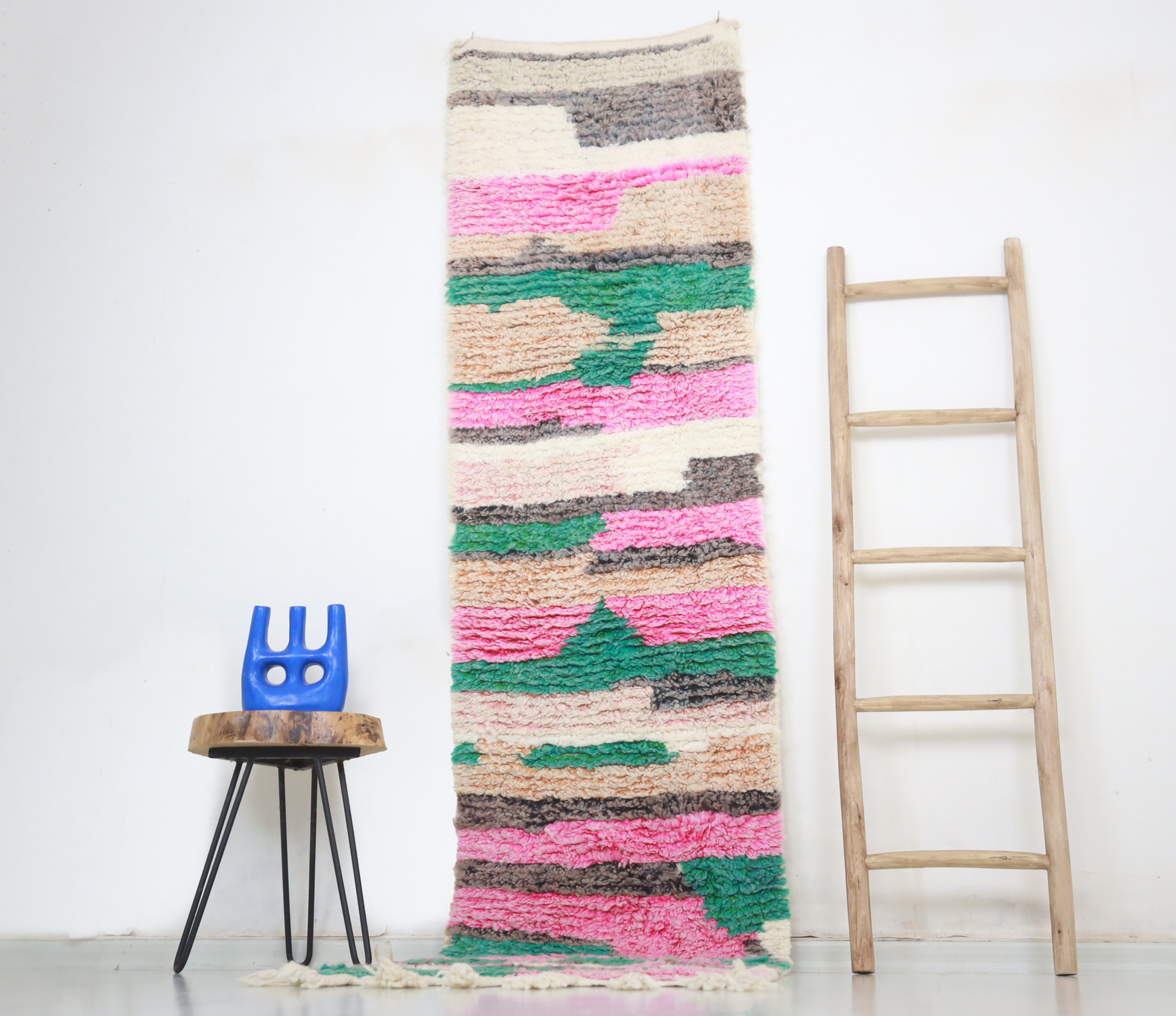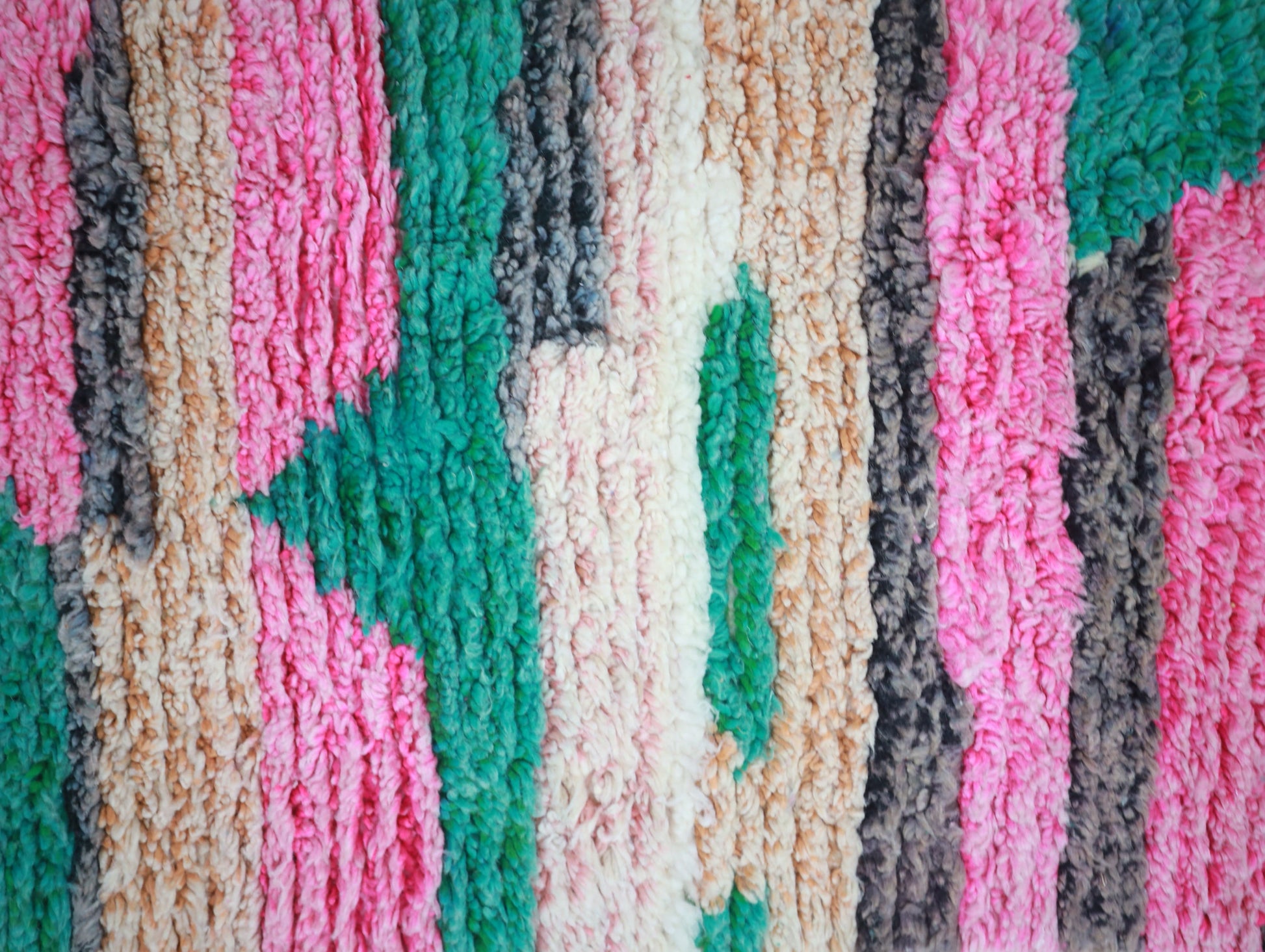 Originating in the Holy town of Boujad, these rugs, woven by diverse tribes, exhibit a wide spectrum of color, composition, and weave. Described as surreal, mystic, and mesmerizing, Boujad rugs transport us to a world beyond reality. Their construction, with twice as many horizontal as vertical knots, renders them floppy and easy to move.
