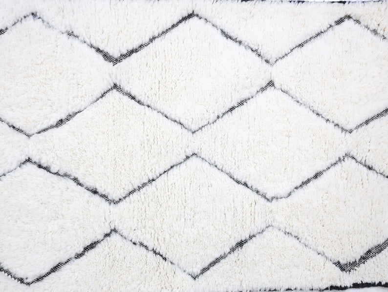 This unique rug, singular in its design, was intricately hand-knotted by the Beni Ourain tribes nestled in Morocco's Middle Atlas mountains.